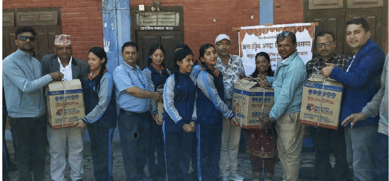 खिलुङ कालिका एग्रो फार्म भीरकोट, खुमा अर्याल फाउण्डेशन भीरकोट र नेपाल लेयर्स कुखुरा पालक संघ काठमाण्डौंको संयुक्त आयोजनामा स्याङ्जाका सामुदायिक बिद्यालयमा अध्ययरत बिद्यार्थीहरुलाई लक्षित गर्दै अण्डा बितरण गरिएको खुमा अर्याल फाउण्डेशनका अध्यक्ष लेखनाथ शर्माले जानकारी दिनुभयो ।