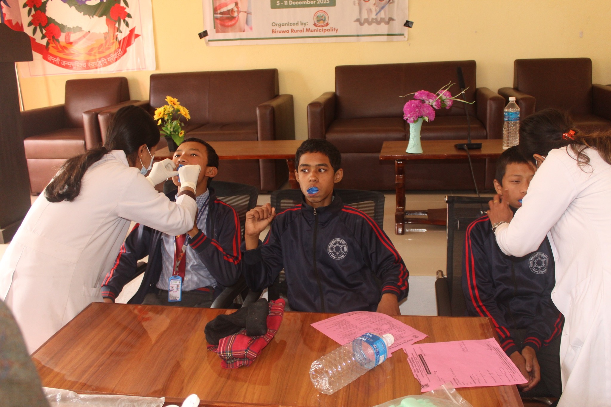 बिरुवा गाउँपालिकाकोे आयोजना र कान्तिपुर डेन्टल हस्पिटल एण्ड रिसर्च सेन्टर तथा वि एम फाउण्डेशनको प्राविधिक सहयोगमा शिविर गरिएको हो । ६ जना चिकित्सक र १ जना जनस्वास्थ्य अधिकृतसहितको टोलीले दाँत तथा मुख परीक्षण गरेका थिए ।