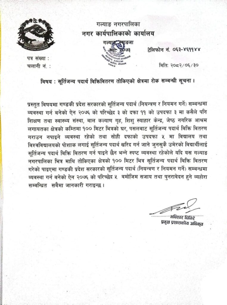 प्रमुख प्रशासकीय अधिकुत भविश्वर घिमिरेले एक सूचना जारी गर्दै सुतिजन्य पदार्थ नियन्त्रण र नियमन गर्न बनेको ऐन अनुसार तोकिएको क्षेत्रमा सुर्तिजन्य पदार्थ विक्रिवितरण नगर्न र नगराउन अनुरोध गर्नुभएको छ । विद्यालय क्षेत्र वरीपरी र स्वास्थ्य संस्था वरीपरी सुर्तिजन्य पदार्थको विक्रिवितरण हुँदा विद्यार्थीहरुमा नकरात्मक असर पर्ने सूचनामा उल्ल्खेख छ ।