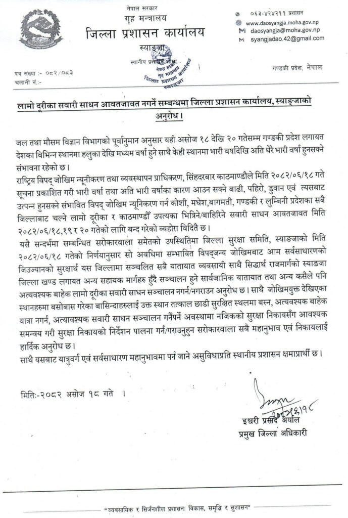 स्याङ्जा १९ असोज । मुलुकभर तीन दिनसम्म मध्यमदेखि भारी वर्षा हुने पूर्वानुमान जारी भएसँगै जिल्ला प्रशाासन कार्यालय, स्याङ्जाले लामो दूरीका सवारी साधनको आवतजावत नगर्न जिल्लाबासीसंग आग्रह गरेको छ ।