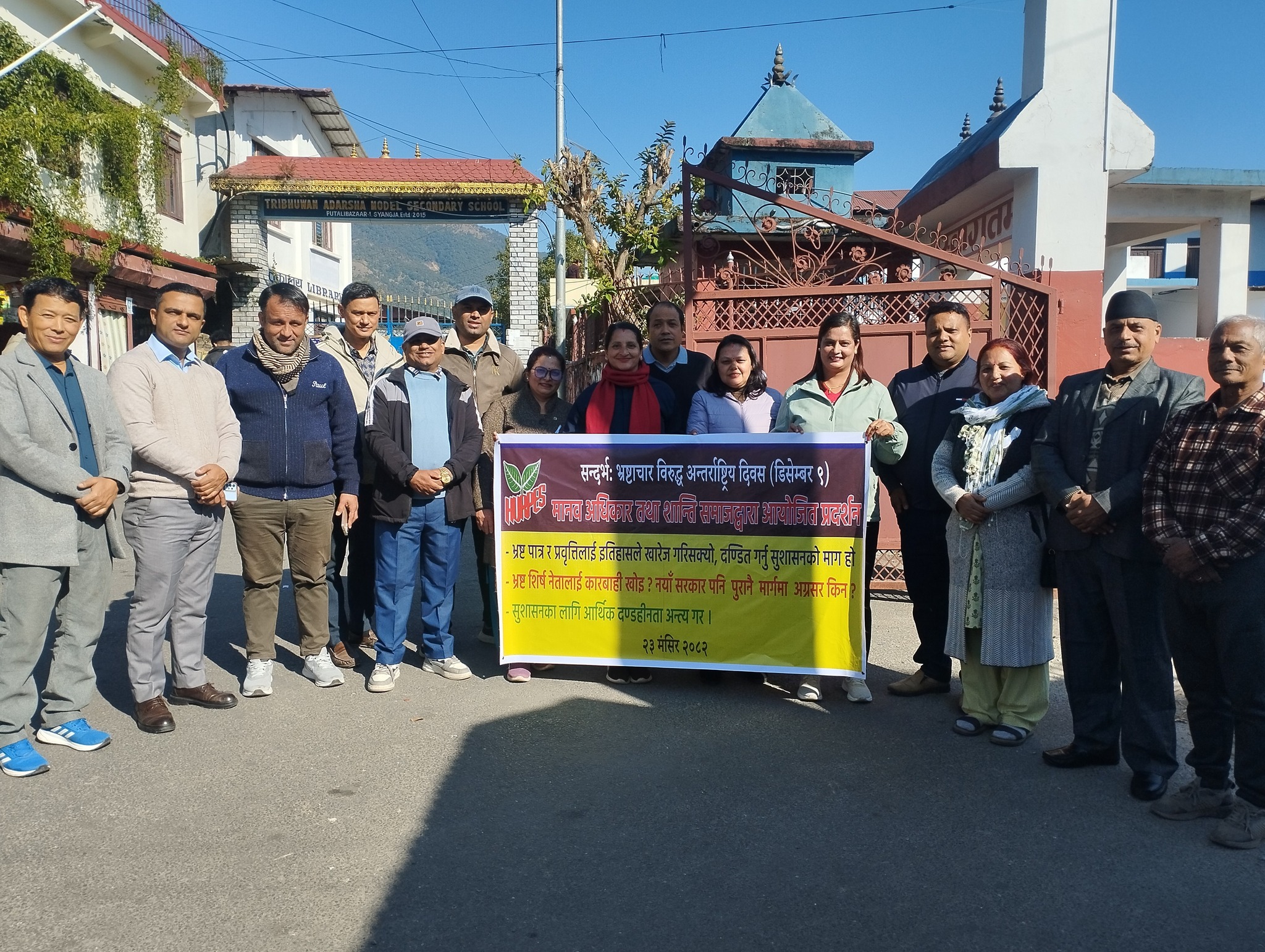 स्याङ्जा २३ मंसिर । भष्ट्राचार बिरुद्धको अन्र्तराष्ट्रिय दिवसको अवसर पारेर मानवअधिकार तथा शान्ति समाज स्याङ्जाले मंगलबार ३ बुदें आग्रह सहितको ब्यानर लिएर जिल्ला सदरमुकाम अर्थात मुख्य बजारमा प्रर्दशन गरेको छ ।