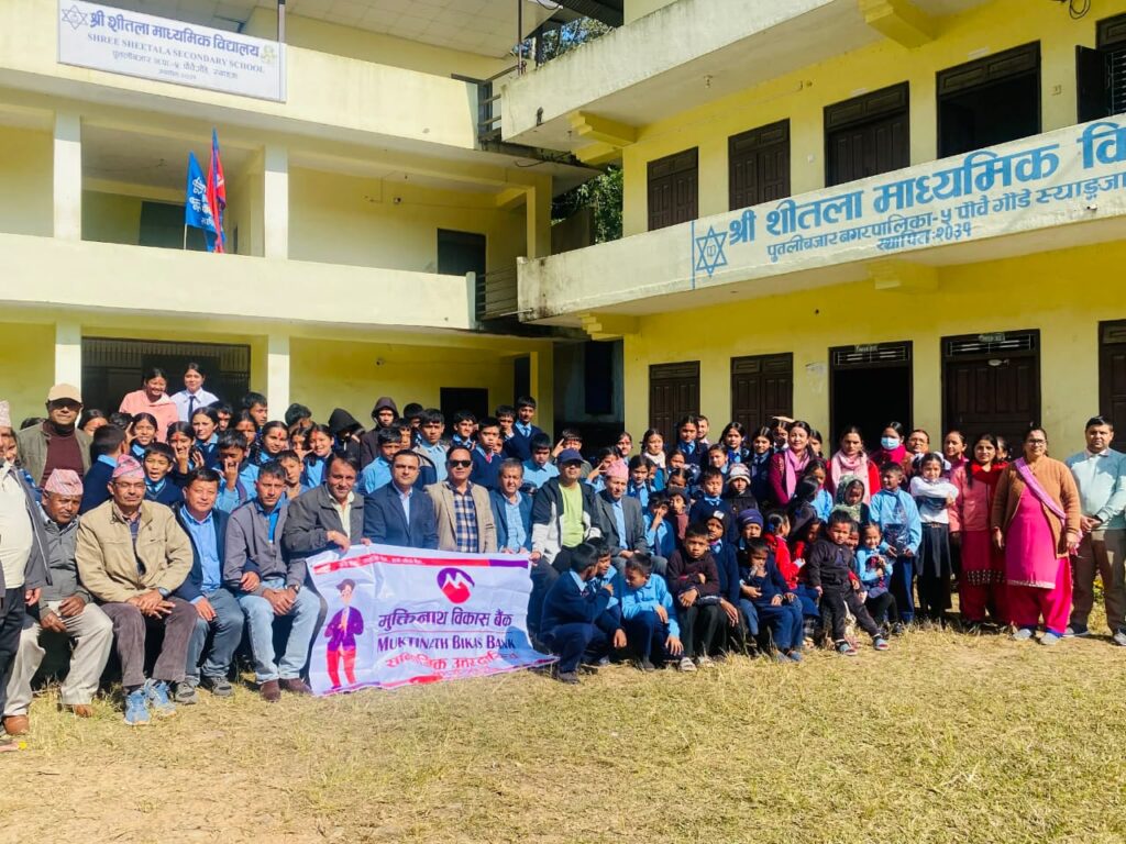 जिल्ला सदरमुकामस्थित पुतलीबजार नगरपालिका वडा नं.–५ पौवैगौडेको गौडेस्थित शितला माध्यमिक विद्यालयमा अध्ययनरत विद्यार्थीलाई बैंकले न्यानो कपडा वितरण गरेको छ । विद्यालयका जेहेन्दार झण्डै १४५ विद्यार्थीलाई बैंकले करिब एक लाख ५० हजार मुल्य बराबरको न्यानो कपडा वितरण गरेको छ ।